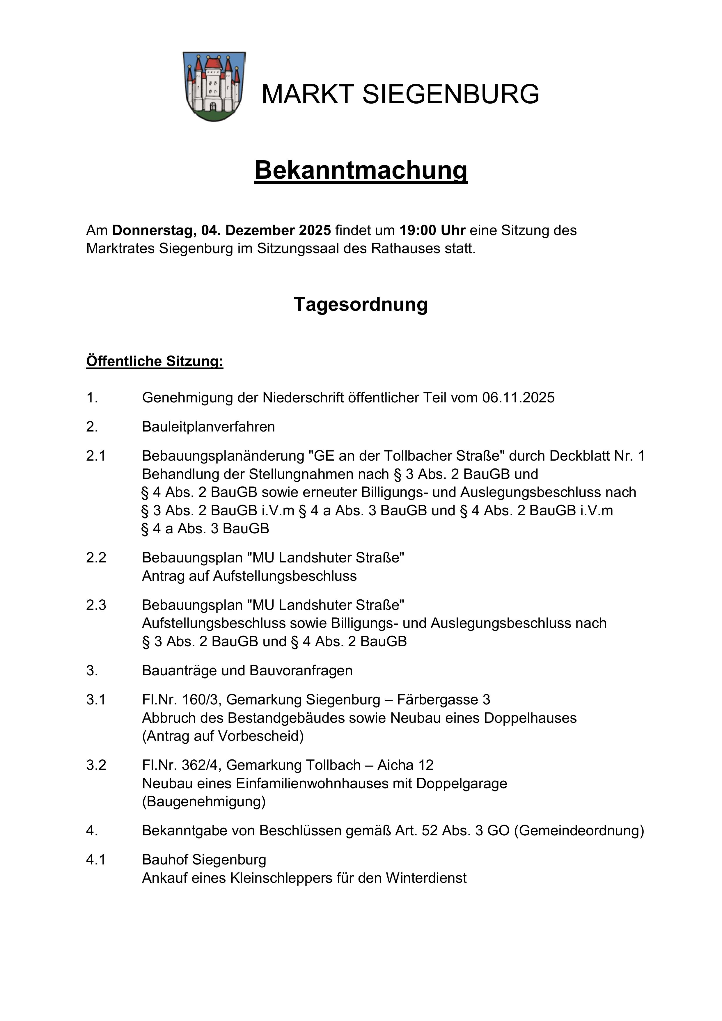Die nächste Marktgemeinderatssitzung findet am 4.12.25 statt.Bekanntmachung - Marktratssitzung Siegenburg am 04.12.2025.pdf