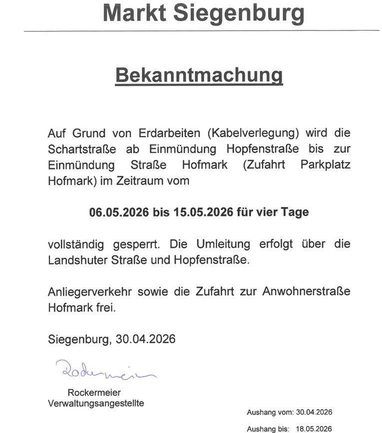 für 4 Tage wird in dem Zeitraum 06.-15. Mai die Schartstraße gesperrt.Veröffentlicht am 30.04.2026 von Karin Einsle