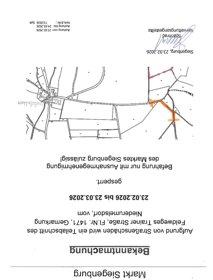 Straßenschäden Feldweg NiederumelsdorfAufgrund von Straßenschäden wird ein Teil des Feldweges Trainer Straße/Niederumelsdorf gesperrt.