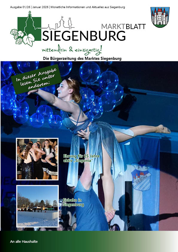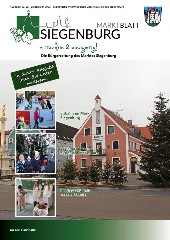 Das Siegenburger Marktblatt erscheint monatlich und wird an alle Haushalte im Marktgebiet kostenlos verteilt. Wir freuen uns, regelmäßig über Informationen aus dem Rathaus, Vereinsnachrichten, Neuigkeiten aus der Geschäftswelt und kulturellen Ereignissen zu berichten.